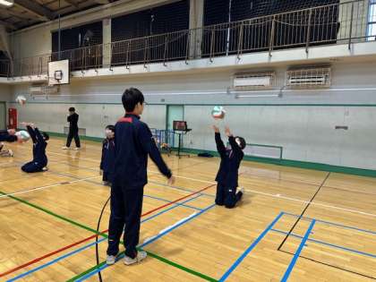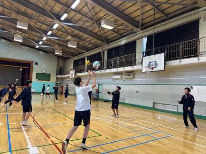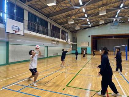体育館ではバレーボールをしています。ペアになってパスの練習をしているところです。