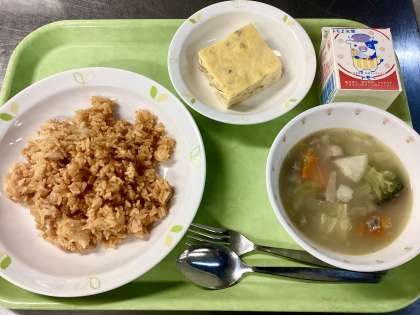 今日は砧中で人気の組み合わせである「チキンライス」「チーズオムレツ」と、「冬野菜のスープ煮」です!チキンライスには肉と人参・玉ねぎが、そしてオムレツの中にはベーコンが少しと牛乳・たっぷりの玉ねぎとチーズが入っています!スープの中には、冬に旬を迎えるブロッコリーやかぶの他に、栄養たっぷりなレンズ豆なども入っています!