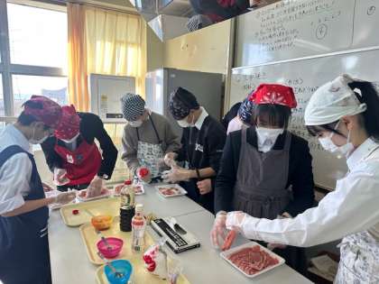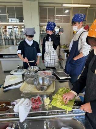 2年生の家庭科は調理実習です。豚の生姜焼きを作ります。付け合わせはキャベツの千切りとミニトマトです。玉ねぎのドレッシングも作っていきます。
