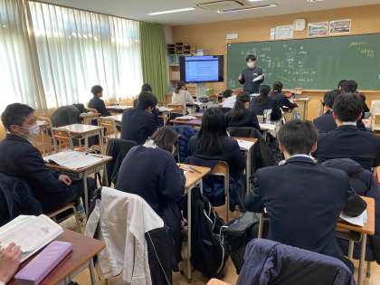 「全数調査」「標本調査」について、より目的に合った調査はどちらか、という授業です。「湖にいる魚の概数を調べよ」という問に、皆さん興味をもって解答していました。