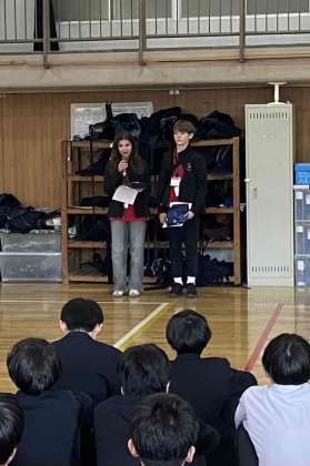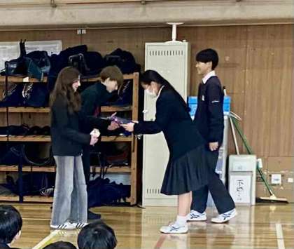 一緒に過ごした2年生を代表して、生徒会役員がお別れの言葉を英語で述べ記念品を渡すと、ウィニペグの生徒からは日本語でお礼の言葉がありました。