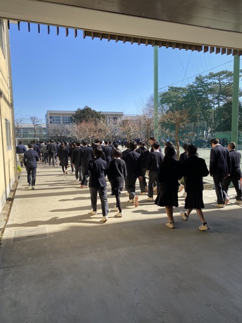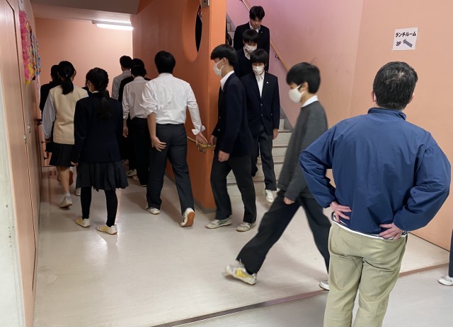 クラスから列を作っての避難とは違い、やや緊張感が薄めだったものの、600人を超える生徒が5分台で避難を終えられたのは良かったと思います。