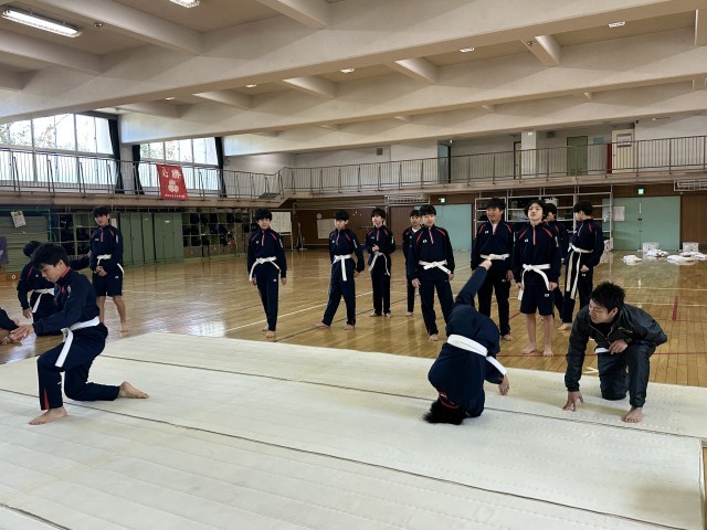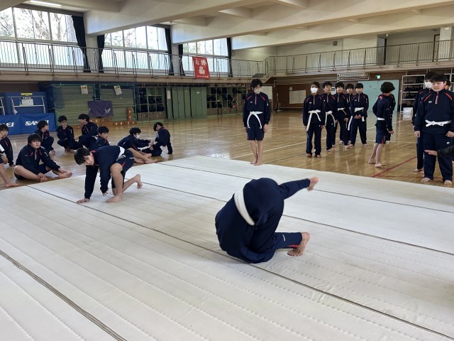 1年生の体育男子は格技室で、柔道の授業です。帯を締めて、前回り受け身の練習をしています。