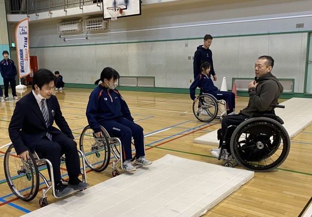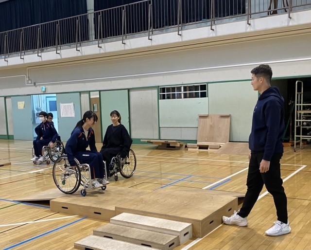バンクーバー・ソチの両パラリンピック金メダリストの元チェアスキーヤーの方を講師に招き、車イスの体験をしています。