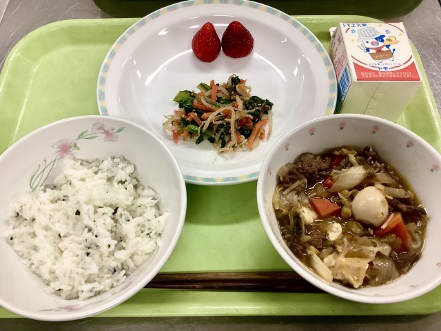 すき焼きに使った肉は「牛肩肉」ですが、肉屋さんから納品された物を見てびっくり!細かい脂のきれいな「サシ」が入っており、「いい肉だ!」というのがひと目でわかる上質な物が届きました!朝から調理員さんと一緒にびっくりでした!その肉を砂糖・醤油・酒で下煮して、味をしっかり染み込ませてから他の食材と合わせて作りましたが、その美味しさにさらにびっくり!本場名店のような、すき焼きの味を堪能しました。