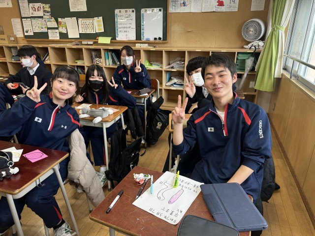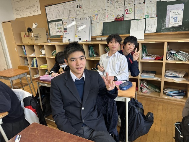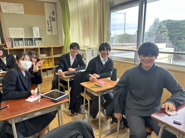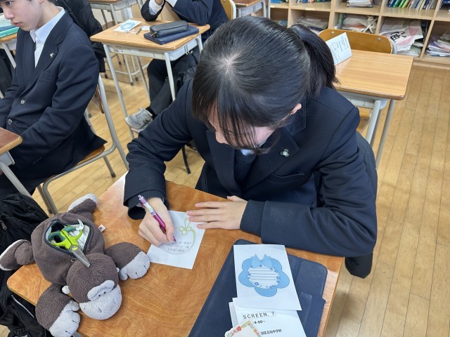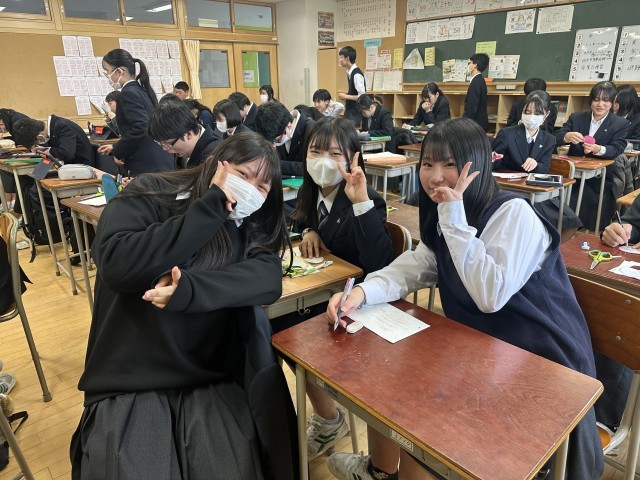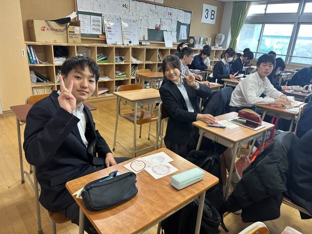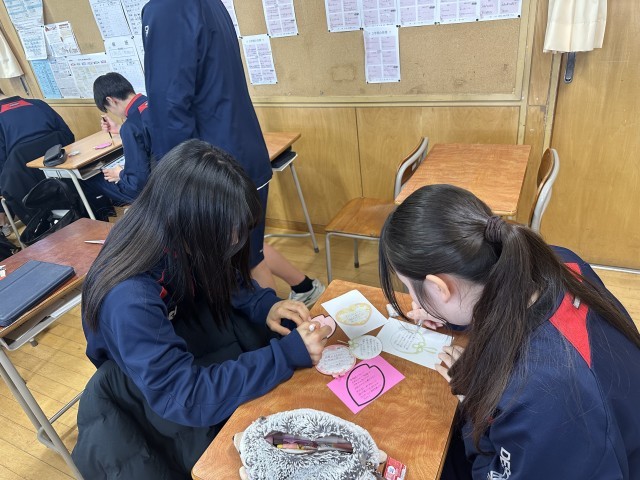 3年生は、卒業に向けて、下級生へのメッセージを作成しています。各クラス、和やかな雰囲気で、それぞれがメッセージを書いたり色を塗ったりしていました。