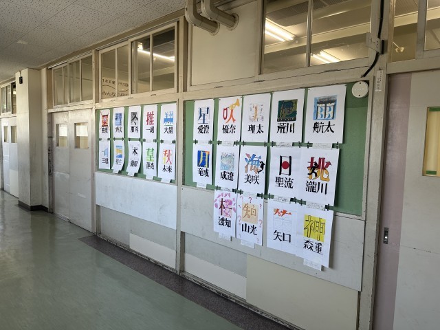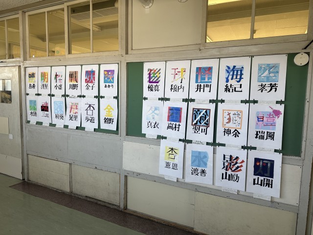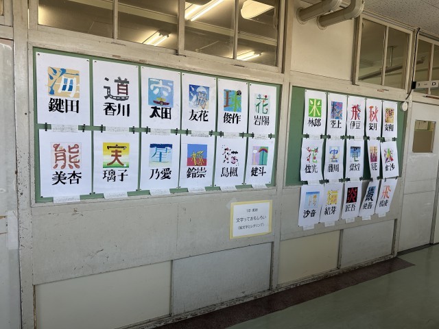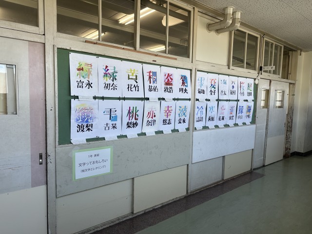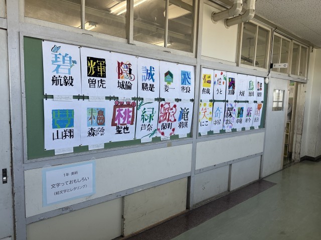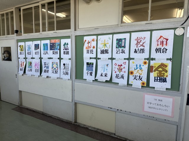 1年生の教室前の廊下に、美術で制作した絵文字とレタリングの作品を掲示しています。どうぞご覧ください。