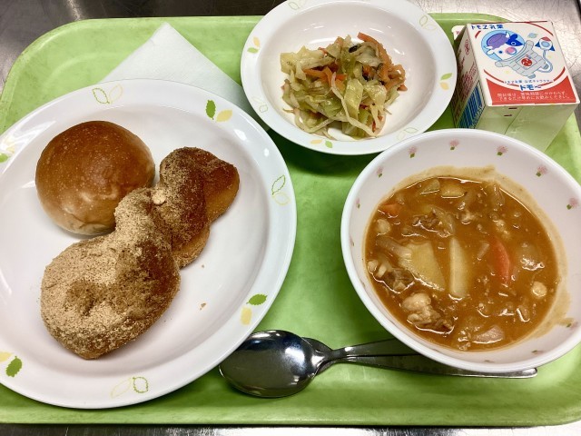 今日は「きな粉揚げパン」・「パインパン」と、2種類のパンが出る日です!パンの中で最もリクエストが多かったのが、「きな粉揚げパン」でした!パンを1個1個、油を吸う前に表面がカラッとする程度になるよう短時間で揚げて、砂糖・塩を混ぜたきな粉をまぶす。給食室では、食欲をそそるきな粉の香りが広がっていました!