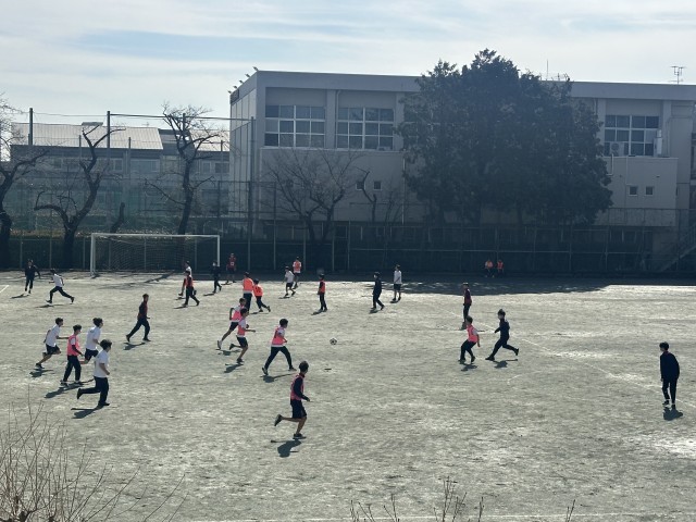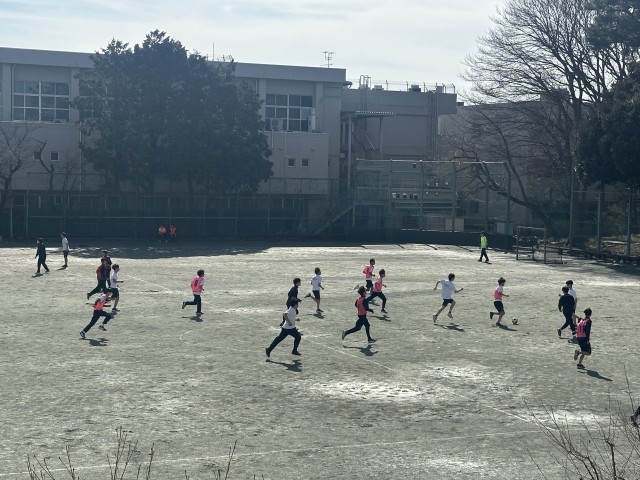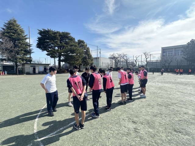 今日、3年生は球技大会です。校庭では男子がサッカーの試合をしています。