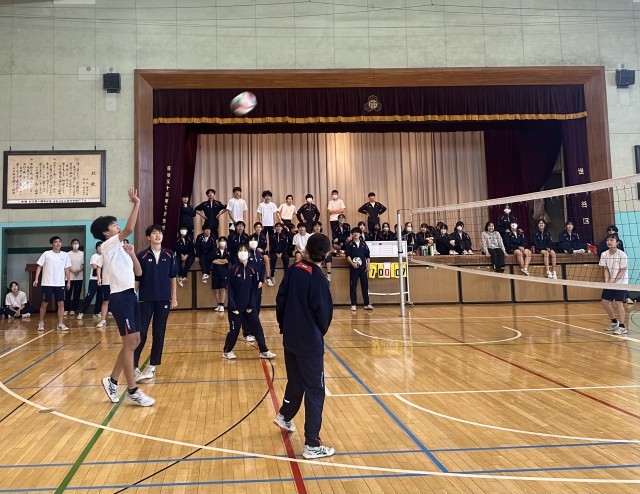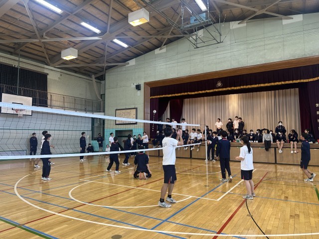 3年生の球技大会、体育館では、男女混合チーム対抗のバレーボールの試合をしています。応援にも熱が入ります。