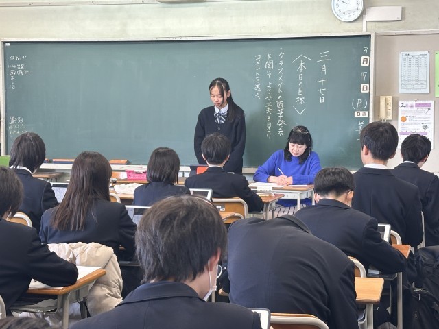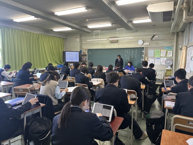 1年生の国語では、それぞれが執筆した随筆を1人ずつ発表しています。クラスのみんなは、発表を聞いて、良さや工夫を見つけて、iPadでコメントを書いています。