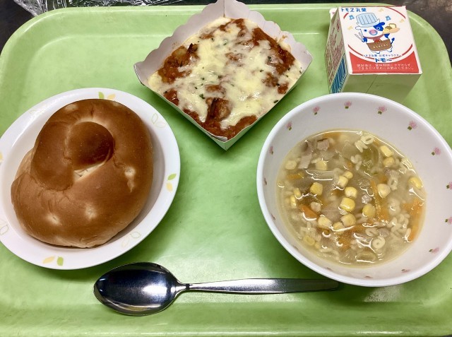 令和7年度2回目の給食は、パインパン・ポテトミートグラタン・ABCスープです!