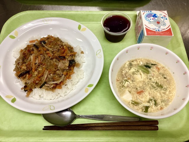青菜と豆腐の卵スープは、私が献立作成時にうっかりしてしまい、先週の金曜日に同じ系統の料理「かき玉汁」を出したばかりで、2回連続で続いてしまいました。