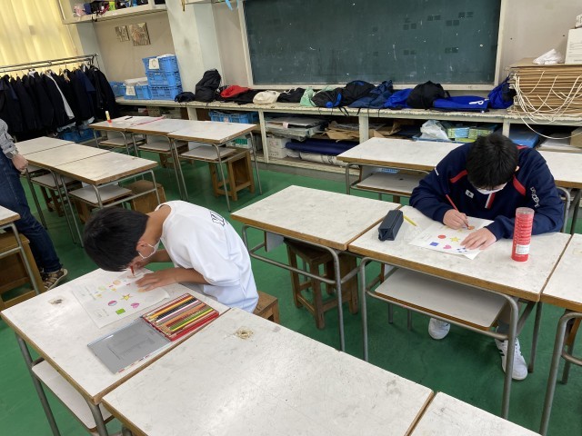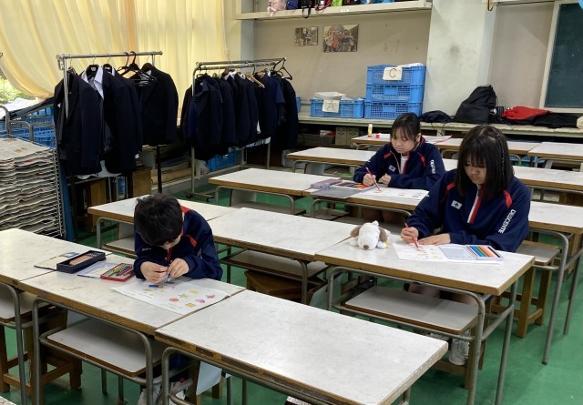 色鉛筆を使い、混色やグラデーションの課題に取り組んでいます。皆さん集中して塗っています。