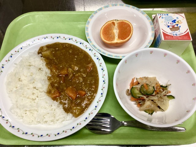 今日のちりめんじゃこは去年度の物よりも大きめで、存在感を強く感じました!苦手と感じる生徒もいるかもしれませんが、大根やきゅうりの味、そしてカレーライスとの組み合わせで、自分なりに工夫をして食べやすくしてもらえたら嬉しいです。