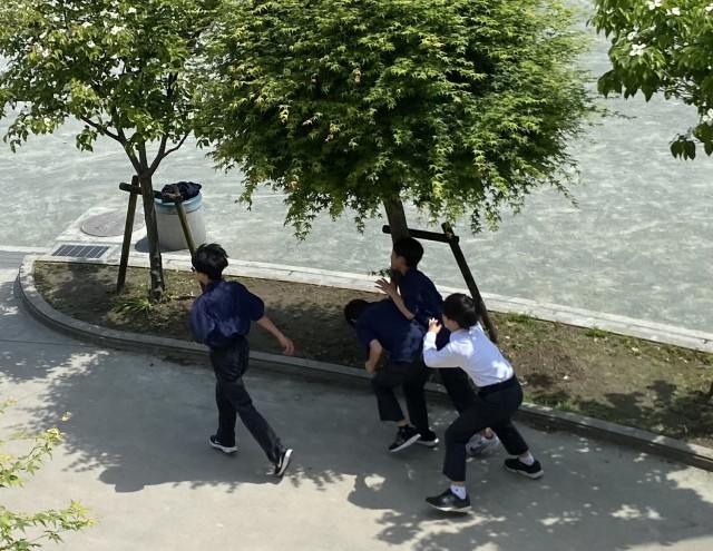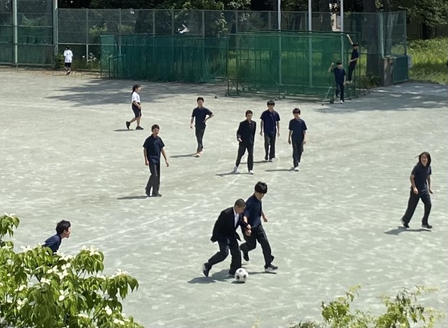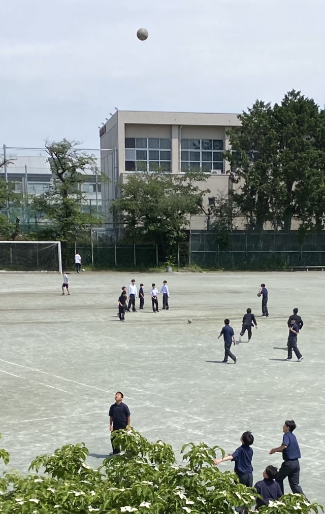 3年生が修学旅行で留守の砧中ですが、昼休みの校庭はいつものように賑わっています。