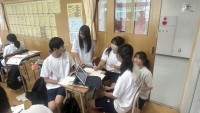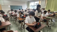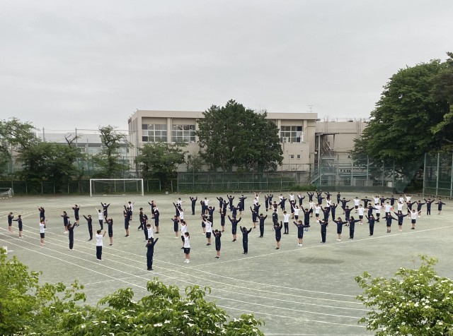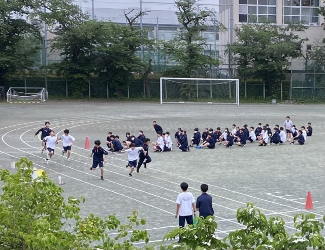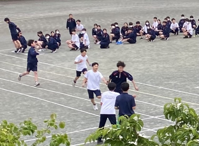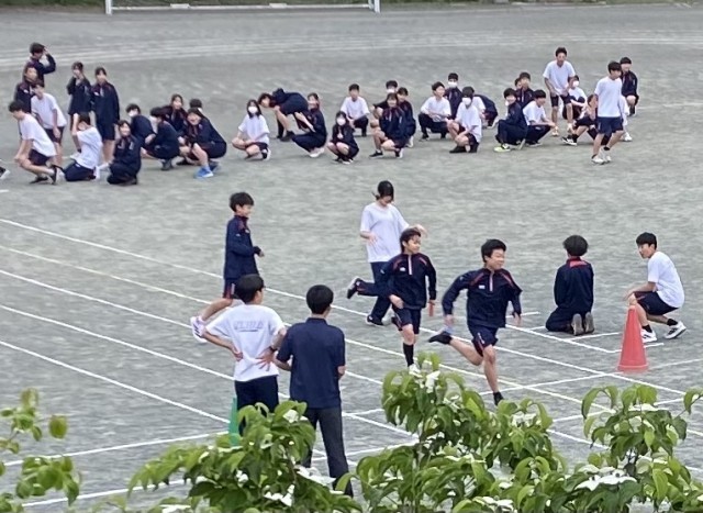 体育の授業では、クラスリレーの練習をしていました。練習とは言え、皆さん真剣!職員室から見ていた先生方も、白熱したレースを楽しんでいました。
