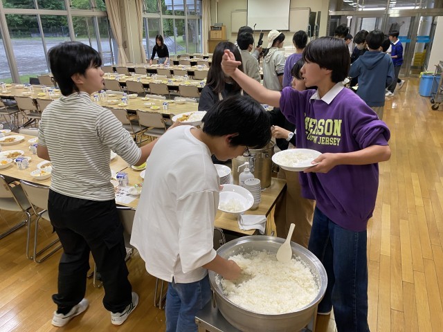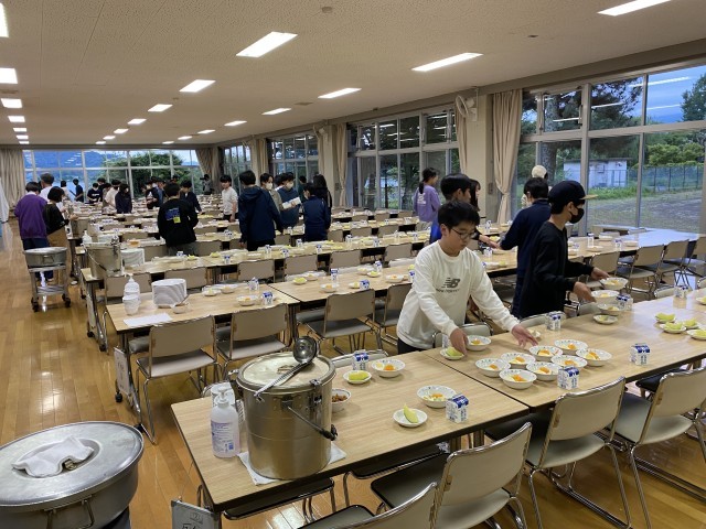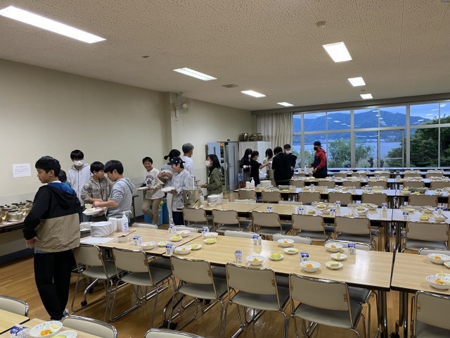 河口湖を見渡す食堂では、夕食準備が進んでいます。