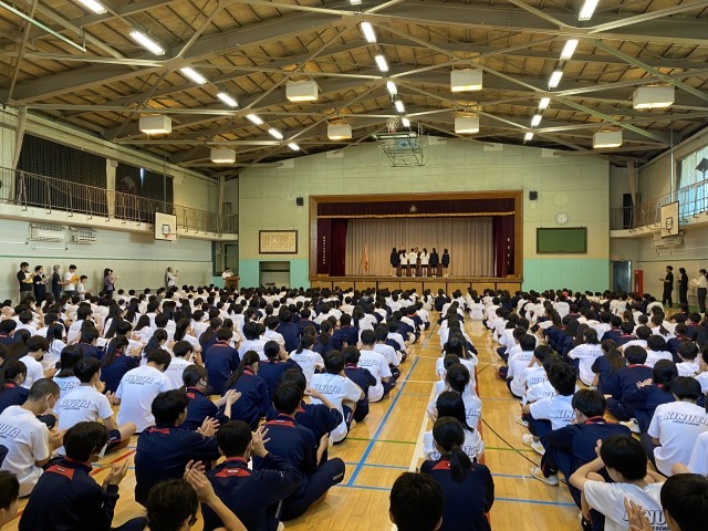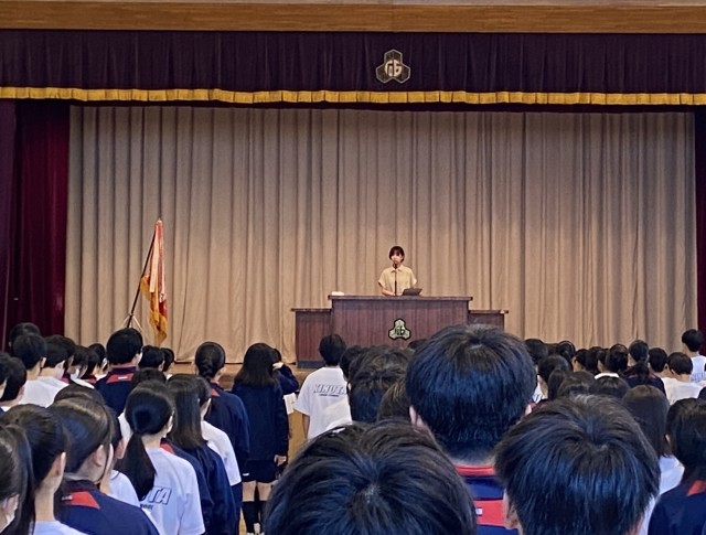 養護教諭からの「区子どもの権利条例」「SOSの出し方」「いじめ防止月間」と「保健に関するお話」の話に生徒の皆さんから拍手がわきました。その後、校長先生から剣道部の表彰をしていただきました。