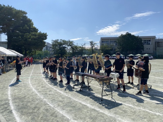 開会式の前に、吹奏楽部が雰囲気を盛り上げるために演奏をしています。