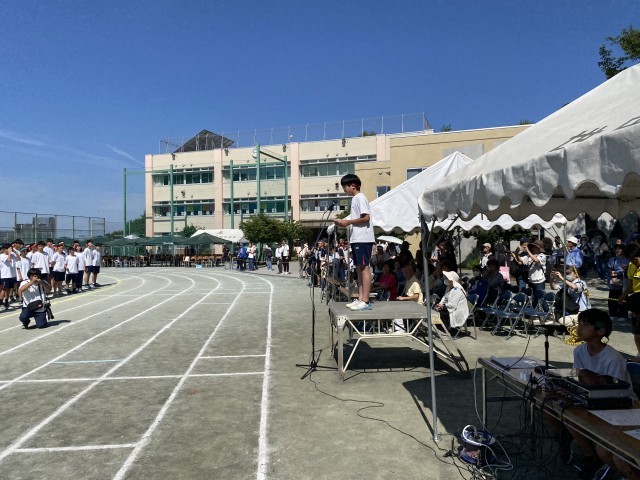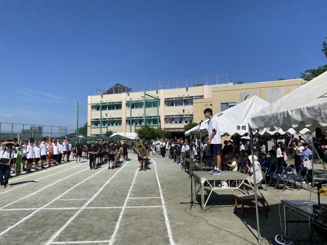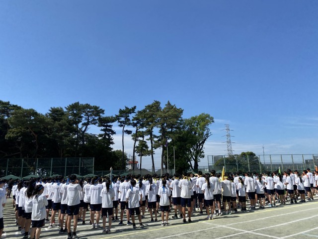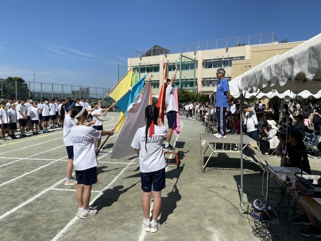 生徒会長の言葉、校旗掲揚、校長先生のお話、生徒代表宣言、諸注意が行われました。