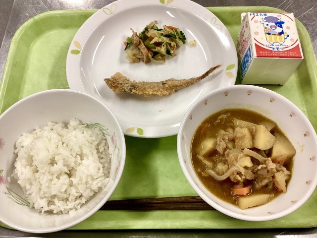 そして、ししゃもフライを合間に食べると、その「サクサク感」と魚がもつ「塩気」によって、ご飯のおかずとして美味しく食べることができます。肉じゃがの味の雰囲気を一気に変えてくれるので、生徒たちも食べるタイミングを考えて、楽しく食事を進めてほしいと思いました。小魚は骨ごと食べられるので、カルシウムもたっぷり!今月もししゃもをしっかり食べて、自分の骨を強くしましょう!