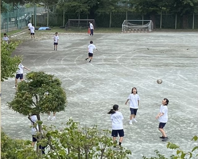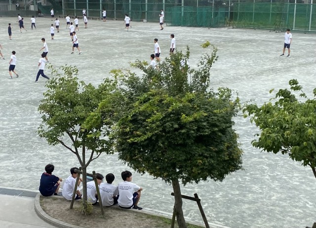 気温は高いものの、風があるので校庭で遊ぶ姿が多く見られます。もちろんエアコンの効いた校内で過ごす生徒も多いですが。