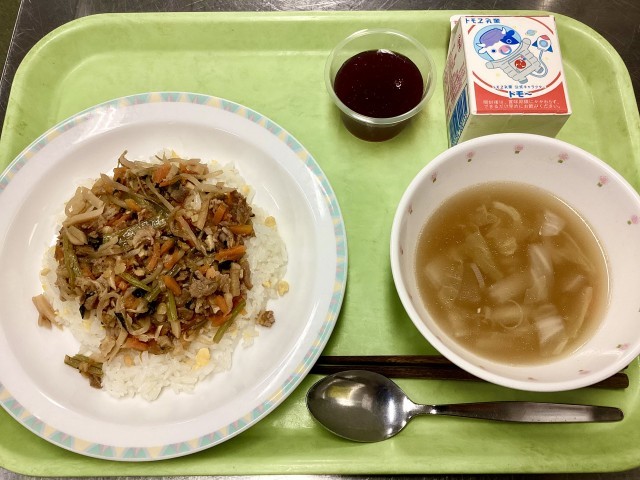 そんな調理員さんたちが作った今日のビビンバですが、最高に美味しい!ご飯には炒り卵が混ざっていますが、これだけだと味がぼんやりした感じになっています。しかし、本当のおいしさを発揮するのは、上に具をのせてから!豚肉・たけのこ・もやし・小松菜などの具は、塩・醤油・砂糖・みりんによる甘辛さだけでなく、豆板醤・コチジャンなどによるコクとピリ辛さも加わっています。暑さで心も体もダウンしそうな時に、気合いを入れてくれる美味しさでした!このしっかりした味にご飯、そして卵の柔らかい食感を時々感じることで、ビビンバの美味しさが成立しています。盛り付けも、教室ではご飯の上に具をのせるだけなので、とても簡単です。今日も早速「美味しかった」という感想が聞けたので、安心です。