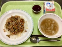 【 メ ニ ュ ー 】・ご飯(有機米)・ししゃもフライ・白菜のお浸し・韓国風肉じ...
