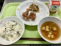 【 メ ニ ュ ー 】・わかめご飯・とり肉のから揚げ・にらもやしのごま風味・けん...