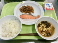 【 メ ニ ュ ー 】・ご飯・鮭の塩焼き・じゃが芋の金平炒め・豆腐とわかめのみそ...