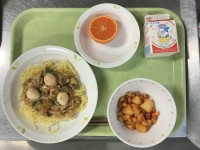 ○献立・五目あんかけそば・ビーンズポテト・カラマンダリン・牛乳○産地・にんにく:...
