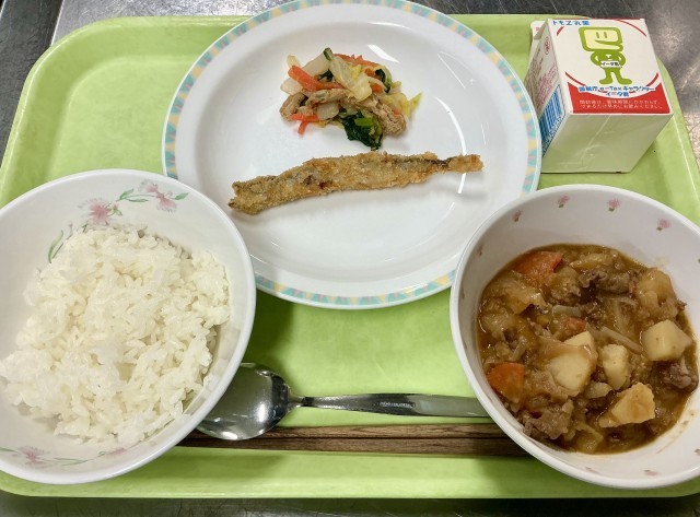 【 メ ニ ュ ー 】・ご飯・ししゃもフライ・白菜のお浸し・韓国風肉じゃが【 産...
