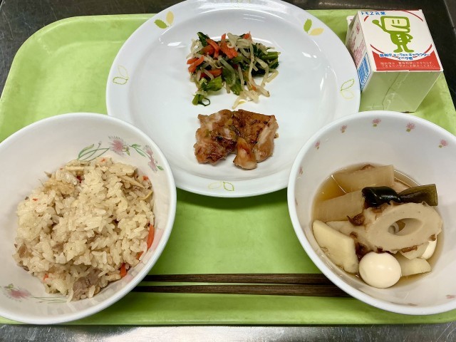 【 メ ニ ュ ー 】・炊き込みおこわ・鶏肉の生姜焼き・野菜の辛子醤油和え・おで...