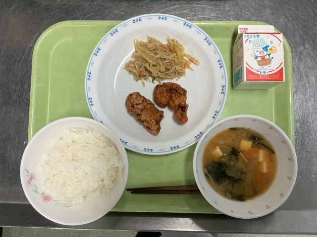 ○献立・ご飯・鶏肉の唐揚げ・和風しらすサラダ・新玉ねぎと豆腐のみそ汁・牛乳○産地...