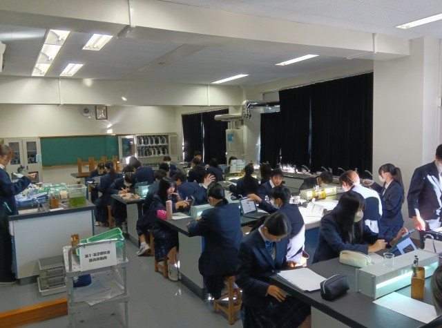 2年生 理科光合成と二酸化炭素の関係北斗館の池から採取したオオカナダモ光合成と二酸化炭素の関係を調べるために光に当てています。30分の待ち時間も調べ学習をしています。(副校長)
