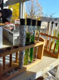 2年生 理科30分経ちました。光を当てた試験管と当てていないもの、BTB溶液の色の違いがわかりますね。ということは、どういうことがわかるのかな?(副校長)