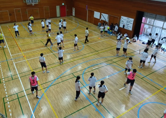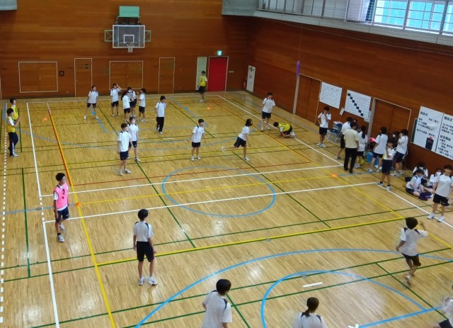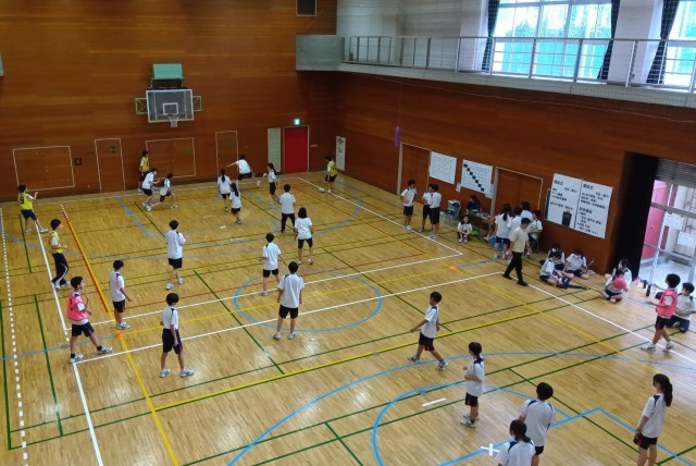 学級委員会が企画運営し、学年ドッヂボール大会を行っています。楽しそうな歓声が上がっています。