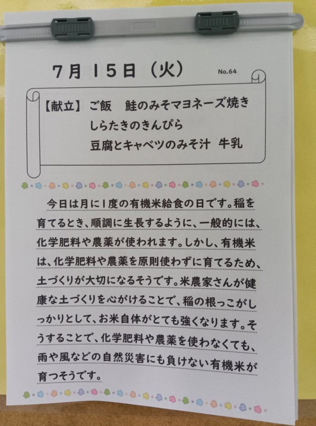 今日は、有機米給食です。白米に合うおかずです。