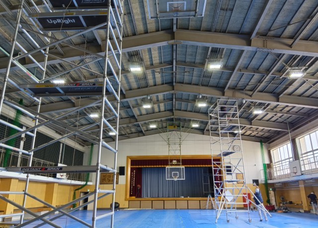 学校では、夏休みに入ってすぐから体育館のLED化工事を行っています。すでに天井の照明は交換が済み、今は明るさの調整中です。皆様、ご理解、ご協力のほどありがとうございます。