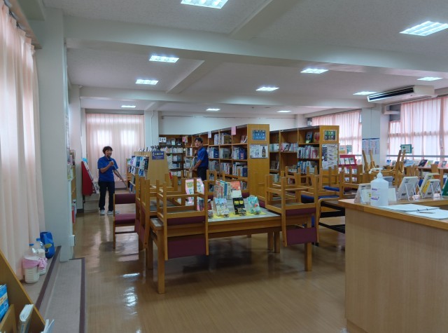 本日は図書室のワックスがけをしていただいています。このように毎日広い校舎内のお部屋をどんどんきれいにしていただいています。
