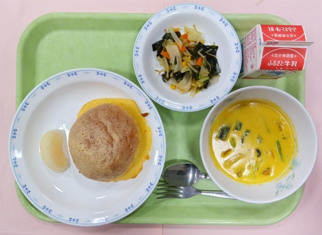かぼちゃのクリームスープは、蒸したかぼちゃがホクホクです。人参、小松菜、かぼちゃの彩りがきれいでクリーミーなスープです。