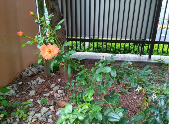 3枚目の写真は、正門横の四季咲きのバラです。健気で可憐な姿にはっとさせられますね。(副校長)