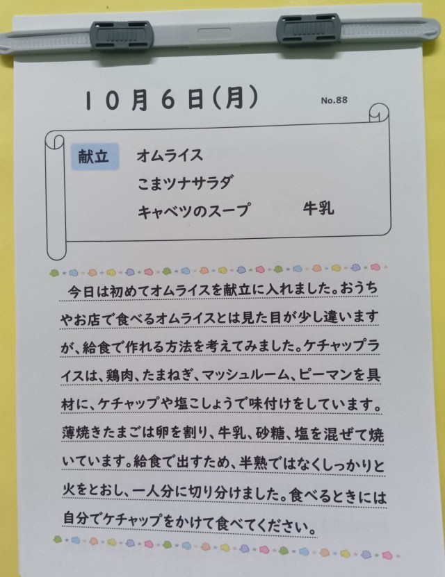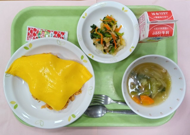 さすが給食は、野菜もたっぷり、栄養バランスがとれていますね。私だとオムライスを作ったらそれだけになってしまいそうです。