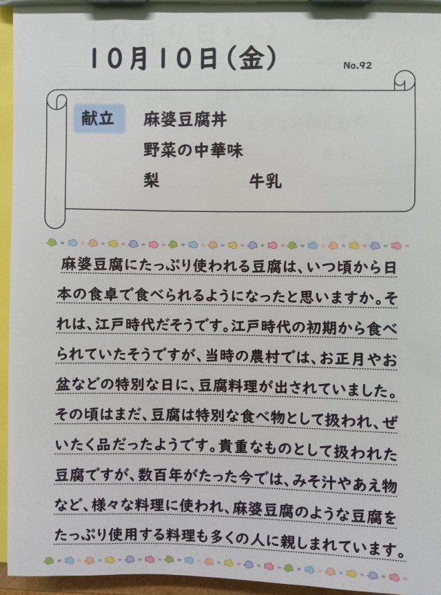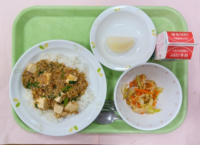 麻婆豆腐丼は、麦入りご飯に麻婆豆腐をかけていただきます。今日はちょっと甘めの麻婆豆腐です。