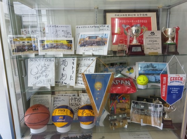 写真は、来賓玄関にあるガラスケースです。地域人材、専門家による特別授業の記念写真やサイン色紙を飾っています。学級数の少ない学校ならではのフットワークの軽さは、北沢中学校のよさのひとつです。