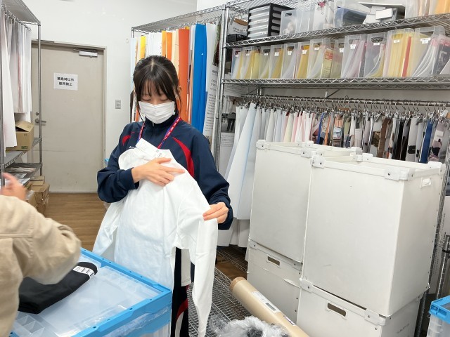 店舗で働く基礎である洋服の整理を学び、実際に売り場の洋服を整えています。