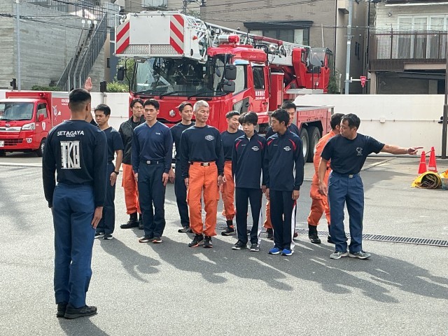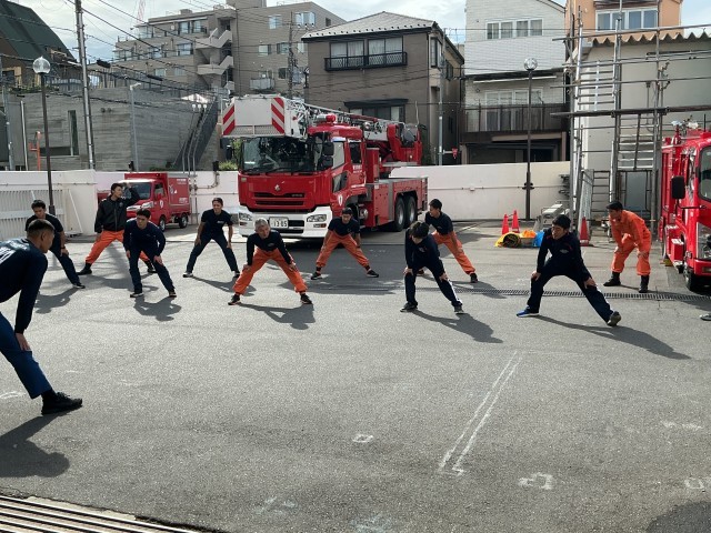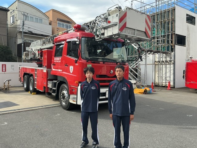 こちらは、三軒茶屋駅近くにある世田谷消防署での様子です。午前中は、世田谷公園で地域の防災訓練に参加しました。午後は、体力錬成ということで、筋トレやランニングのメニューをこなします。その後、ハシゴ車に乗って訓練があるそうです。高いところの作業が少しこわいかもしれませんが、頑張ってくださいね!