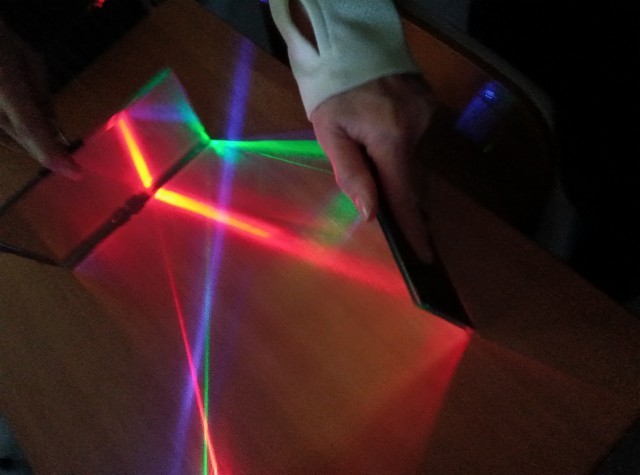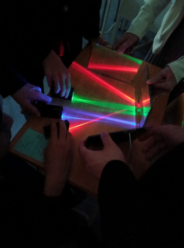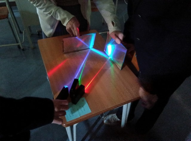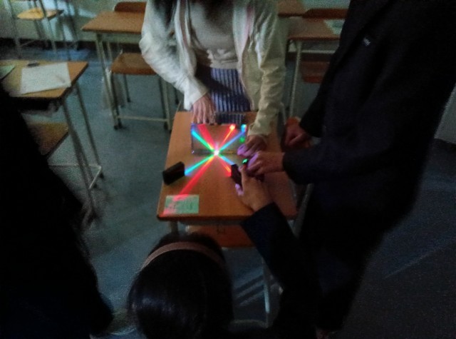赤、青、緑の光を鏡に当てて、反射の仕組みを考察しています。鏡の向きを変えたりして、きれいな光の模様ができました。(副校長)