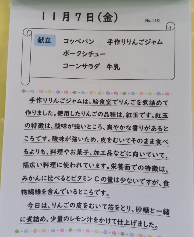 今日はコッペパンに手づくりりんごジャムを添えています。りんごジャムの甘さがちょうどいいです。